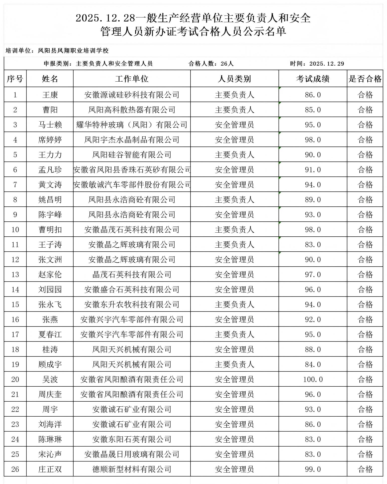 2025年第四期一般生产经营单位主要负责人和安全管理人员于12月28日进行考试,参考人数26人,考试合格26人,合格率达100%,以下为本次考试合格人员名单。