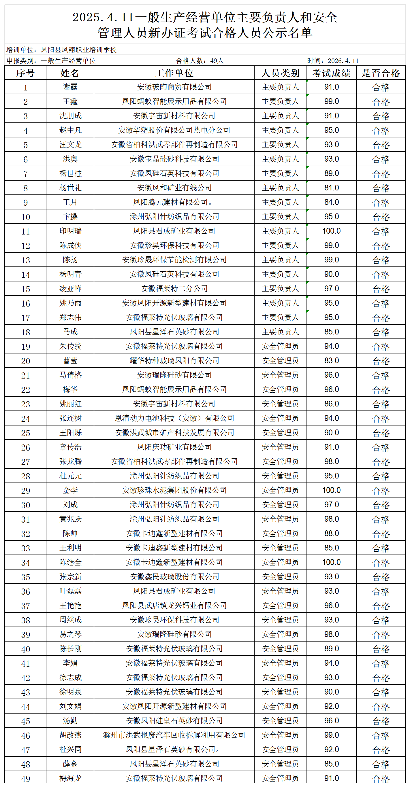 2026年第1期一般生产经营单位主要负责人和安全管理人员于4月11日进行考试,参考人数50人,考试合格49人,合格率达98%,以下为本次考试合格人员名单。